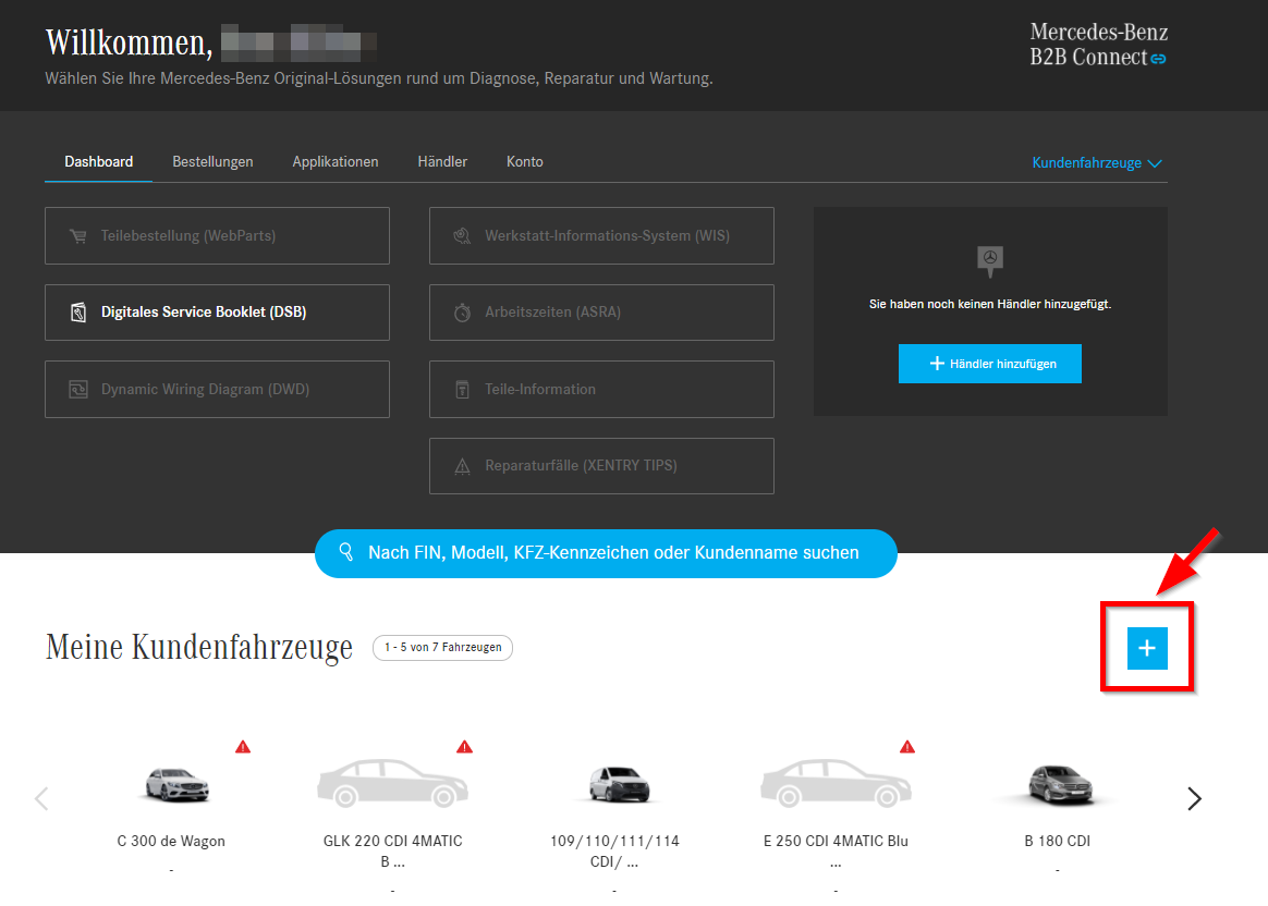 Im Dashboard des b2bconnect.daimler.com findet man unter den Anwendungen den Bereich „Meine Kundenfahrzeuge“ und dort ein PLUS-Zeichen. Mit einem Klick auf das Pluszeichen wird mit der Eingabe der Fahrgestellnummer ein Fahrzeug aufgerufen und gespeichert. Jetzt kann man das Fahrzeug auswählen und erhält sofort ein Überblick, ob Rückrufaktionen offen sind. Sogar einen kompletten Überblick des DSB ist hier enthalten und man erkennt sofort auf einen Blick, ob das Fahrzeug scheckheftgepflegt ist. In dieser Übersicht wird ebenfalls angezeigt, wann der nächste Service fällig wird und man kann von hieraus direkt in das DSB springen und einen neuen Eintrag erstellen. So hat die Werkstatt einen guten Überblick über die gesamten Mercedes Kundenfahrzeuge.