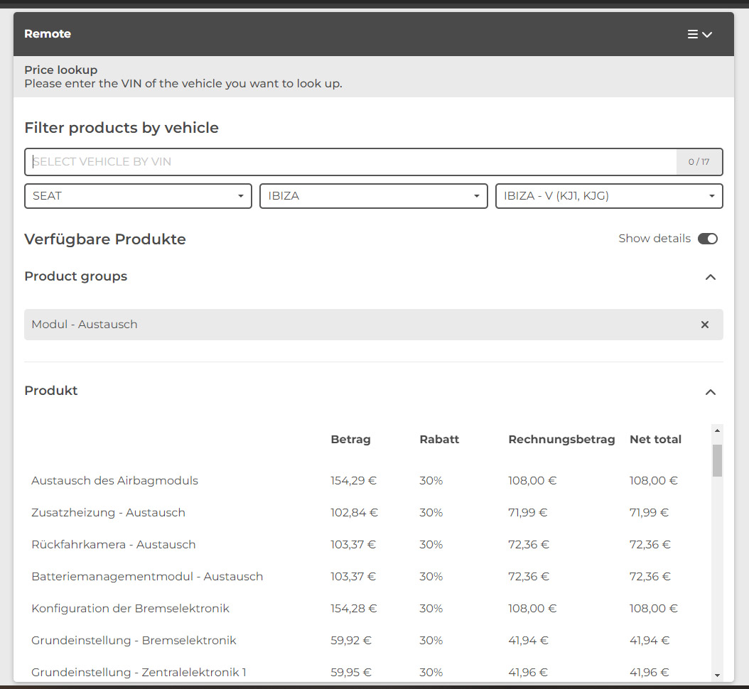 Diese Änderung dient der Verbesserung der Transparenz und der klaren Kommunikation der Kosten für unsere Dienstleistungen. Der neue Preiskatalog zeigt die Endkundenpreise an, während auf der Rechnung für Sie als Werkstatt ein Rabatt ausgewiesen wird (siehe Bild). Der neue Preiskatalog gibt Ihnen die Möglichkeit, die Preise direkt an Ihre Kunden weiterzugeben. Sie können dann genau sehen, welche Kosten auf Sie zukommen und diese transparent an Ihre Kunden weitergeben. Bei den angeführten Beträgen handelt es sich um eine unverbindliche Preisempfehlung, die Sie als Werkstatt dem Kunden berechnen können. Sie erhalten bei der Buchung natürlich einen Rabatt.